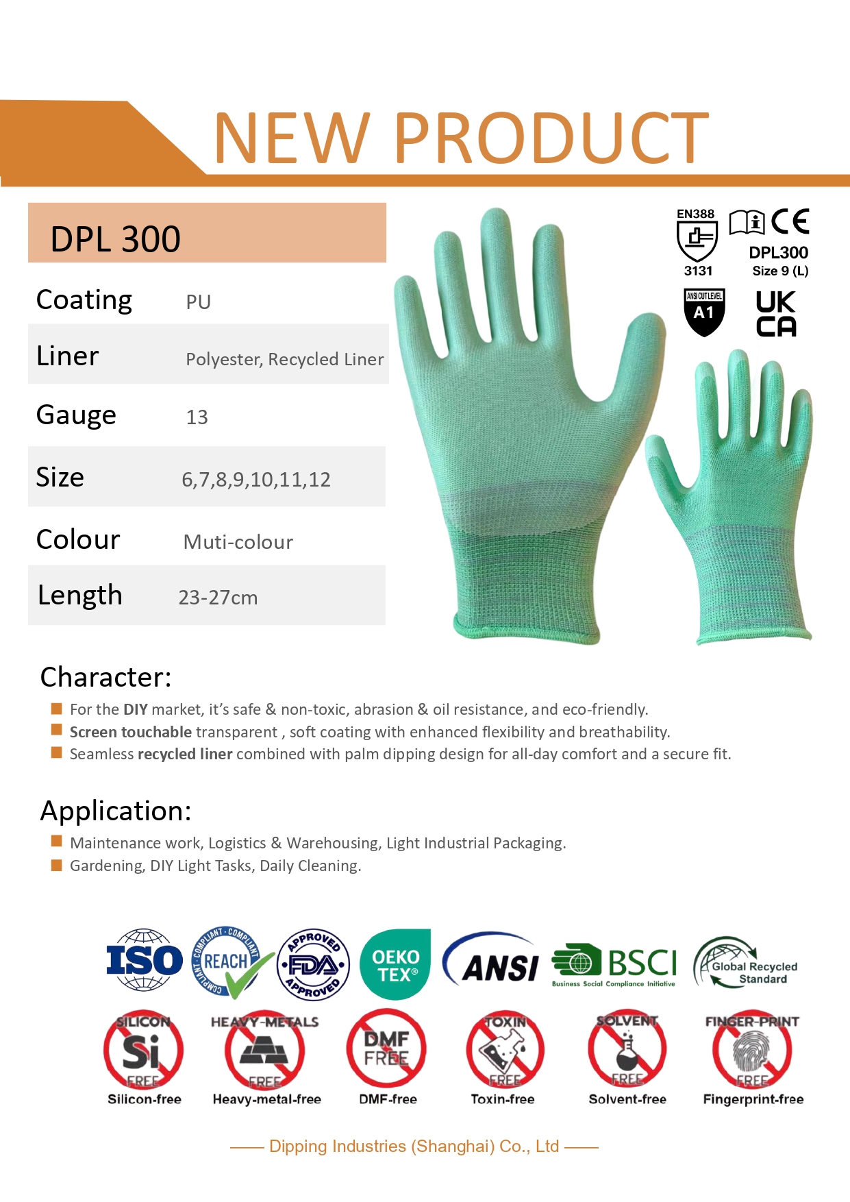 Character:: 1.Seamless recycled liner combined with screen touchable transparent & soft coating glove. 2.For the DIY market, it’s safe & non-toxic, abrasion & oil resistance, and eco-friendly Application: 1.Maintenance work, Logistics & Warehousing, Light Industrial Packaging. Gardening, DIY Light 2.Tasks, Daily Cleaning....